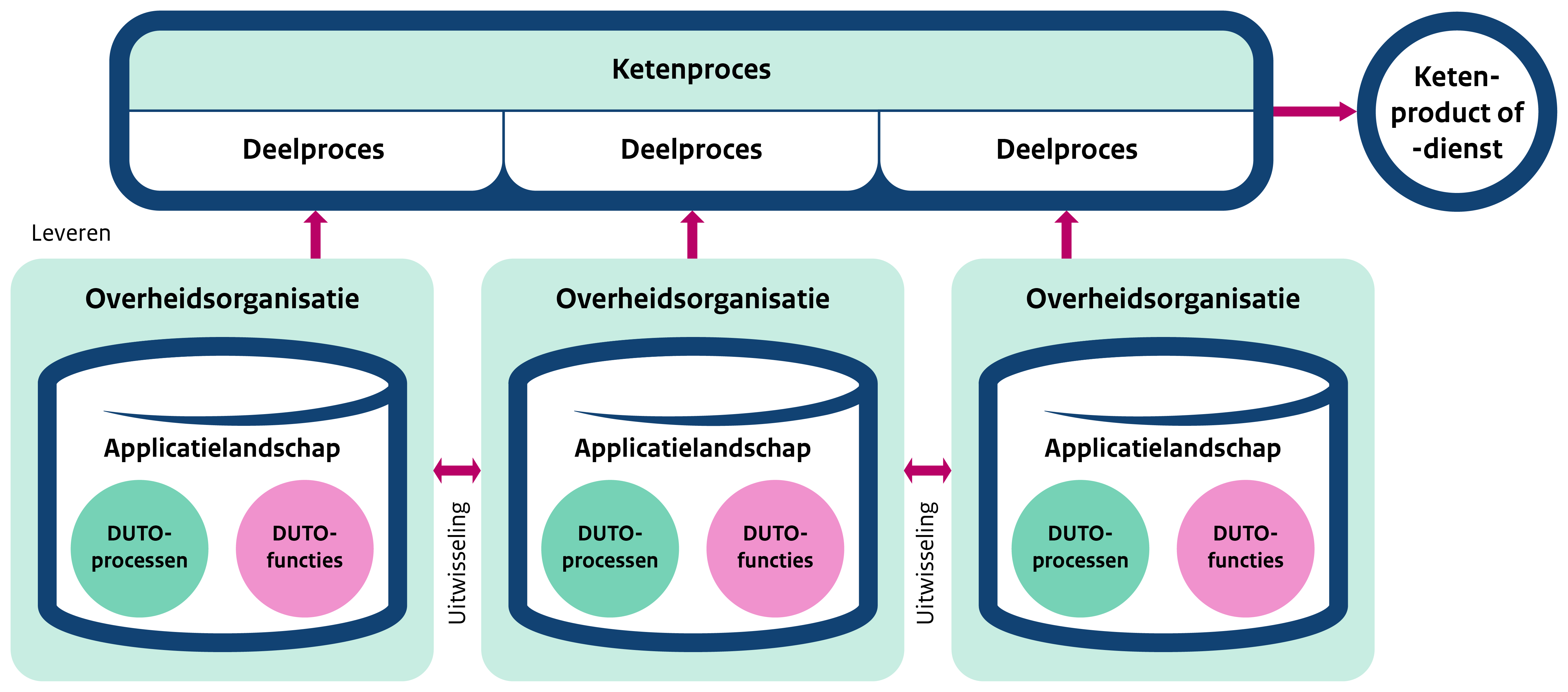 In deze afbeelding staat elk deelproces door middel van een streep in verbinding met een blok. Elke streep staat voor het leveren van ondersteuning aan het deelproces. In elk blok staan dezelfde onderdelen. Elk blok staat voor een overheidsorganisatie. En binnen het blok dat een overheidsorganisatie voorstelt staat een applicatielandschap. Met daarin twee bolletjes van verschillende kleur. Eén bolletje staat voor de DUTO-processen en één bolletje staat voor de DUTO-functies. Tussen de blokken die de overheidsorganisaties voorstellen staat een pijl twee kanten op die de uitwisseling van gegevens tussen de overheidsorganisaties voorstelt.