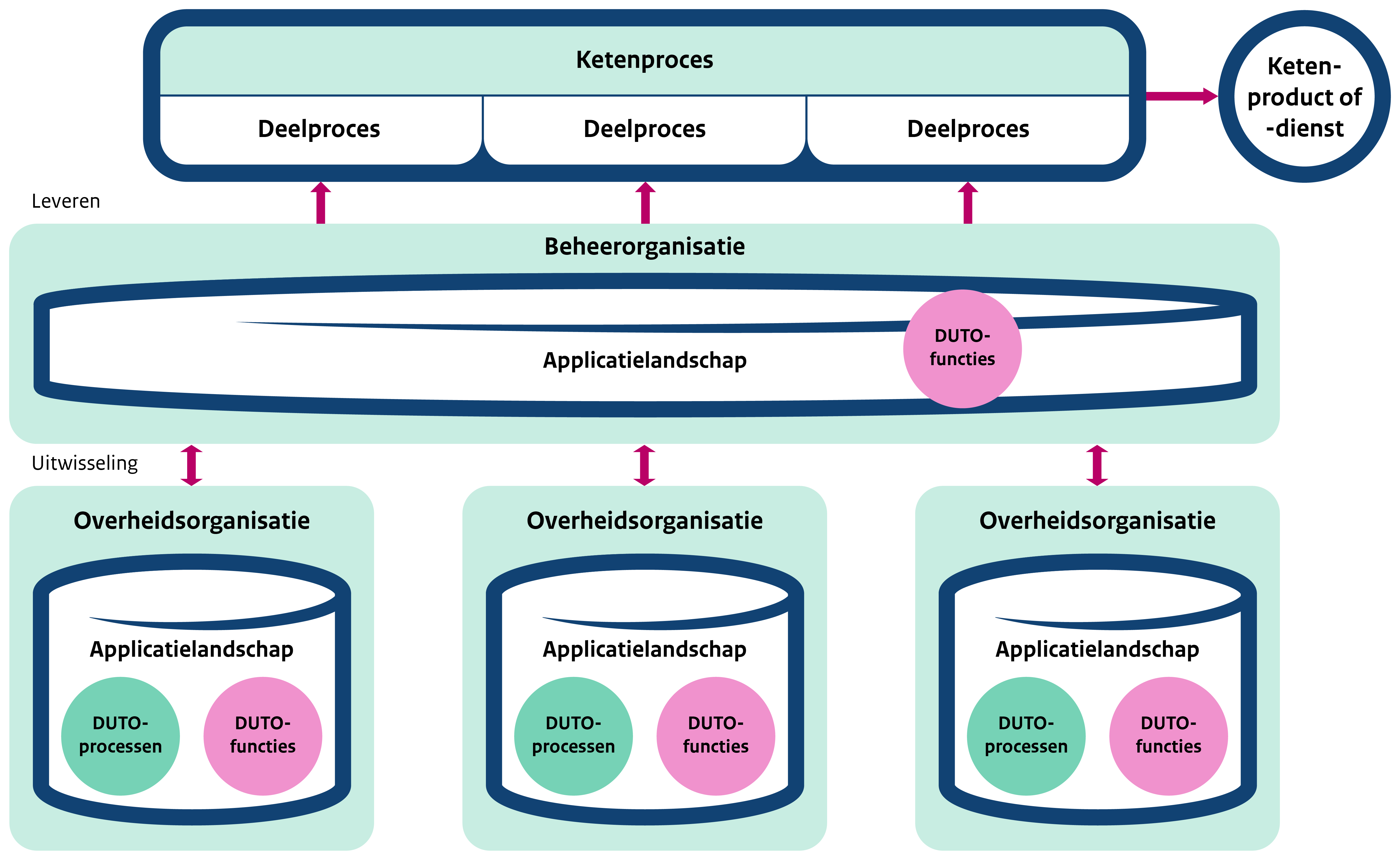Onder dit blok staat een blok dat staat voor een beheerorganisatie. Die staat via pijltjes in verbinding met de deelprocessen. In het blok van de beheerorganisatie staat een applicatielandschap. Met daarin een bolletje dat de DUTO-functies voorstelt. Met de pijltjes wordt aangegeven dat het applicatielandschap DUTO-functies levert aan de deelprocessen.