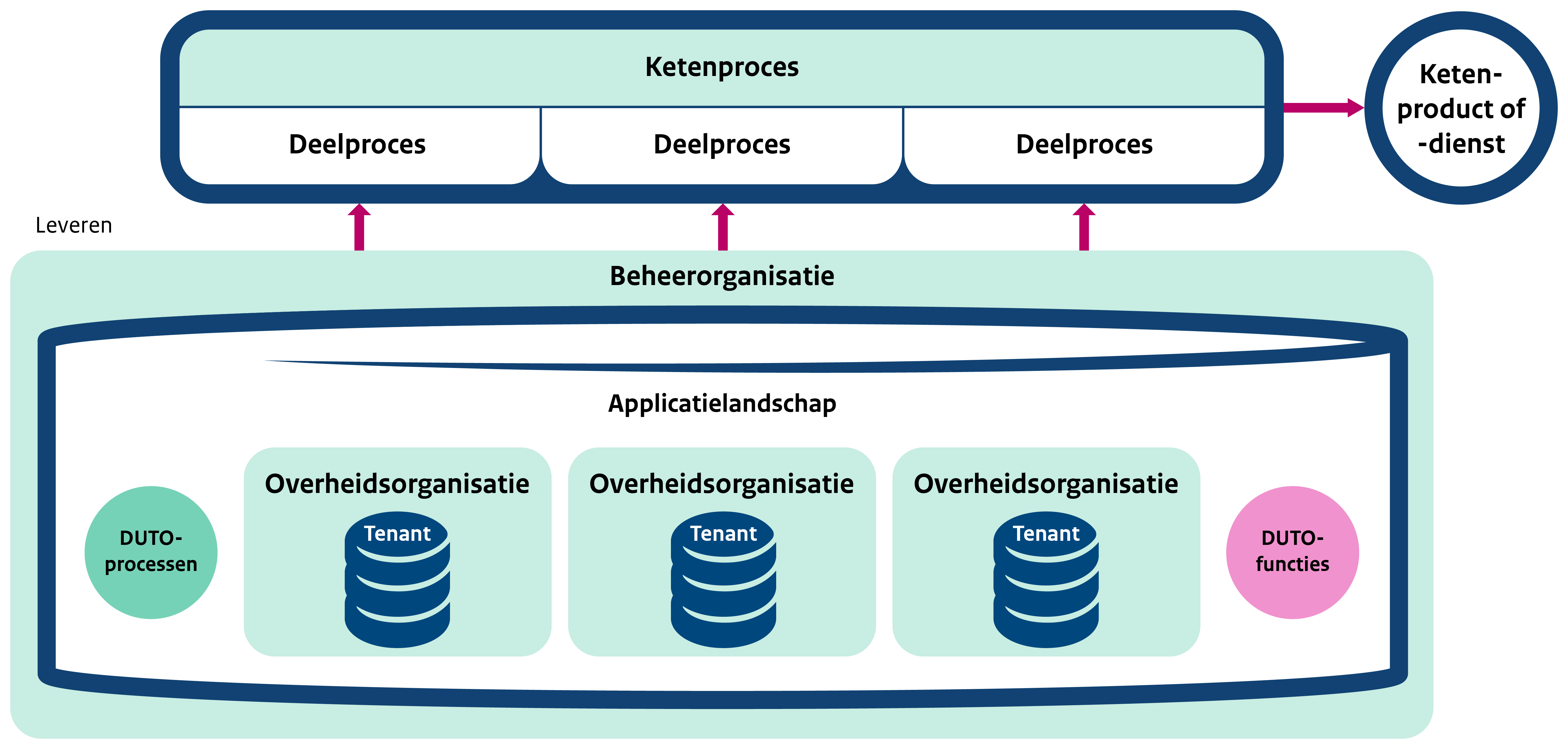 Onder het blok van het ketenproces staat een ander blok. Dit blok staat in verbinding met het ketenproces door middel van pijl. In dit blok staat een beheerorganisatie die een applicatielandschap beheert. In het applicatielandschap staan drie blokken van overheidsorganisaties met daarin een symbool van een database. Dit stelt de verschillende tenants voor binnen het applicatielandschap. Daarnaast staat in het applicatielandschap ook twee bolletjes van verschillende kleuren. Deze staan voor de DUTO-processen en de DUTO-functies.