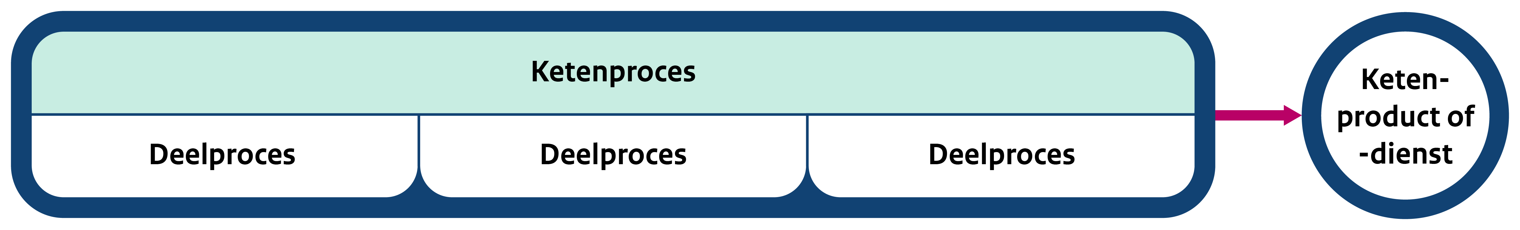 Op de afbeelding is te zien dat een ketenproces bestaat uit verschillende deelprocessen. Als voorbeeld in dit plaatje bestaat het ketenproces uit drie deelprocessen. Het ketenproces leidt tot een ketenproduct of -dienst.