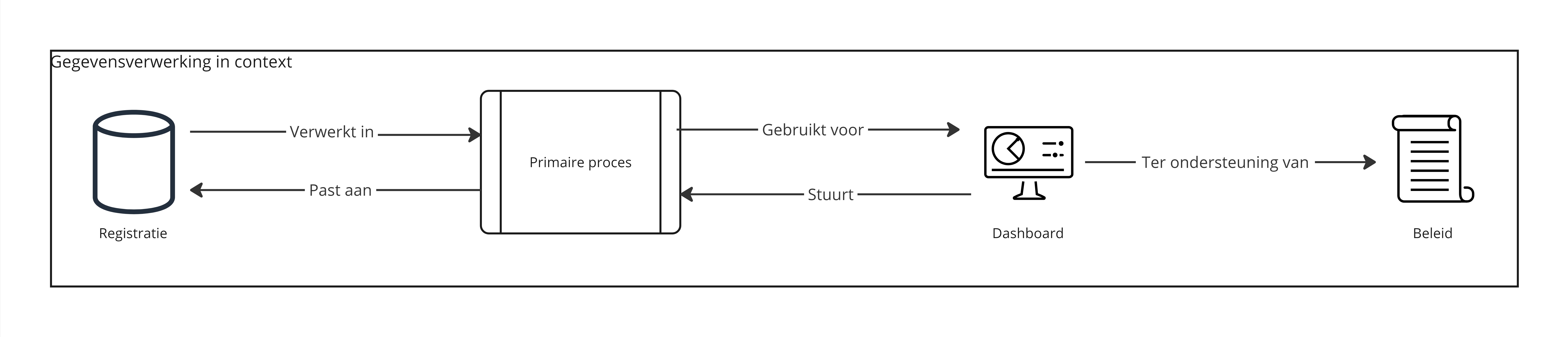 In de afbeelding worden de verschillende contexten getoond waarin gegevens worden verwerkt en hoe onderlinge afhankelijkheden zijn.