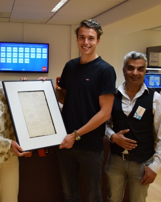 Melvin van Oppen, student geschiedenis uit Amsterdam maakte de 100.000e scan en kreeg voor deze bijzondere mijlpaal een hoge resolutie print van het Plakkaat van Verlatinge overhandigd door Ina Dijkman, hoofd Dienstverlening van het Nationaal Archief. Melvin doet voor zijn bachelorscriptie onderzoek naar de Nederlandse politieke besluitvorming voor de aanval op Engeland in 1688. Hij maakt scans van archiefstukken in het Nationaal Archief omdat hij dan thuis verder kan met zijn onderzoek. "Nu kan ik in het weekend doorwerken, het scheelt me ontzettend veel tijd." Zo levert het scanapparaat een bijdrage aan efficiënt onderzoek doen.