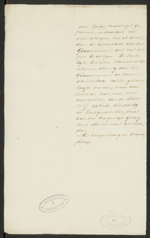 - Letter of Secretary Janssen to Rev. C.W. Pape at Heusden, regarding Hendrik Scholte, 22 May 1834. Written at the time of the Secession, the letter refers to the ecclesiastical procedures in process against Scholte. Janssen also indicates that, “now that the Ultramontanist Reformed are so turbulent,” stringent measures will have to be taken against ministers who refuse to toe the line. National Archives of the Netherlands, coll. 2.07.01.03, Archive of the Department of Reformed and Other Worship, except Roman Catholic, 1815-1870, inv. no. 1555.