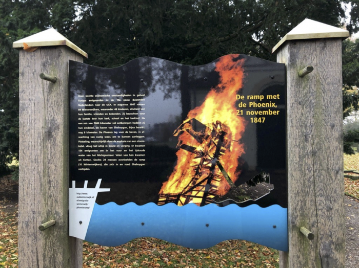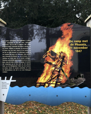 I love to make evening walks in the town of Winterswijk, where I was born. The Dutch habit of keeping curtains open makes strolls resemble visits to a museum, with the windows framing paintings that offer ever-changing views. I like to discover routes to find new, unfamiliar places. One evening, in December 2020, I pass the old graveyard of Winterswijk, a place that usually gives me the creeps. For some reason—I still don’t know why—, I decide to walk across the graveyard this time. I immediately spot a brightly lit memorial: two bollards holding up a colorful plaque. The sign reads: “The Phoenix Tragedy, 1847.” As I read the text aloud, it immediately becomes clear to me that the passengers—people from my own town—must have gone through hell. But the question that really strikes is: why didn’t I know this? Why did nobody, not my parents, nor a school teacher, ever tell me about this tragedy?