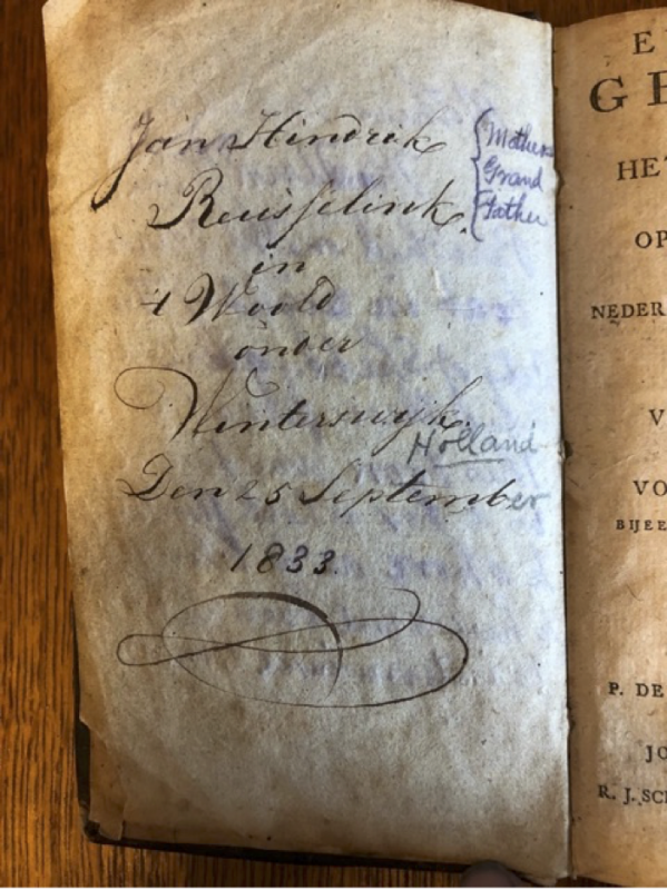 On a sunny day in July 2022 I stand at the shore of Lake Michigan, together with Rebecca and Kim Foster. They are descendants of Harmen Jan and Johanna and I was about to contact them after a search that took several months. From the water’s edge we survey the lake before us and in our mind’s eye we see the tragedy that happened here long ago. The psalmbook Jan Hendrik presented to Harmen Jan was on the Phoenix when the ship caught fire. Afterwards it washed ashore in a wooden chest. It suffered a bit of water damage, but it is otherwise in good condition. I know that, because I am holding it in my hand. The book was passed through the generations in the female line and thus came into the possession of the Foster sisters. The writing on the flyleaf at the front of the book reads in beautiful and elegant letters: “Jan Hendrik Reuselink, ’t Woold, near Winterswijk, 25 September 1833.” I run my fingers over the text and it hits me: here I am, in the middle of America, holding a book that was owned by someone from the town where I was born! And it’s not just that, while researching my genealogy I also discovered that I am related to Harmen Jan Reuselink as well as to Johanna Oonk. They both held this book in their hands, perhaps during the voyage, but most certainly after they had survived the tragedy. I hope it gave them the strength to come to terms with the awful memories of that dreadful night.