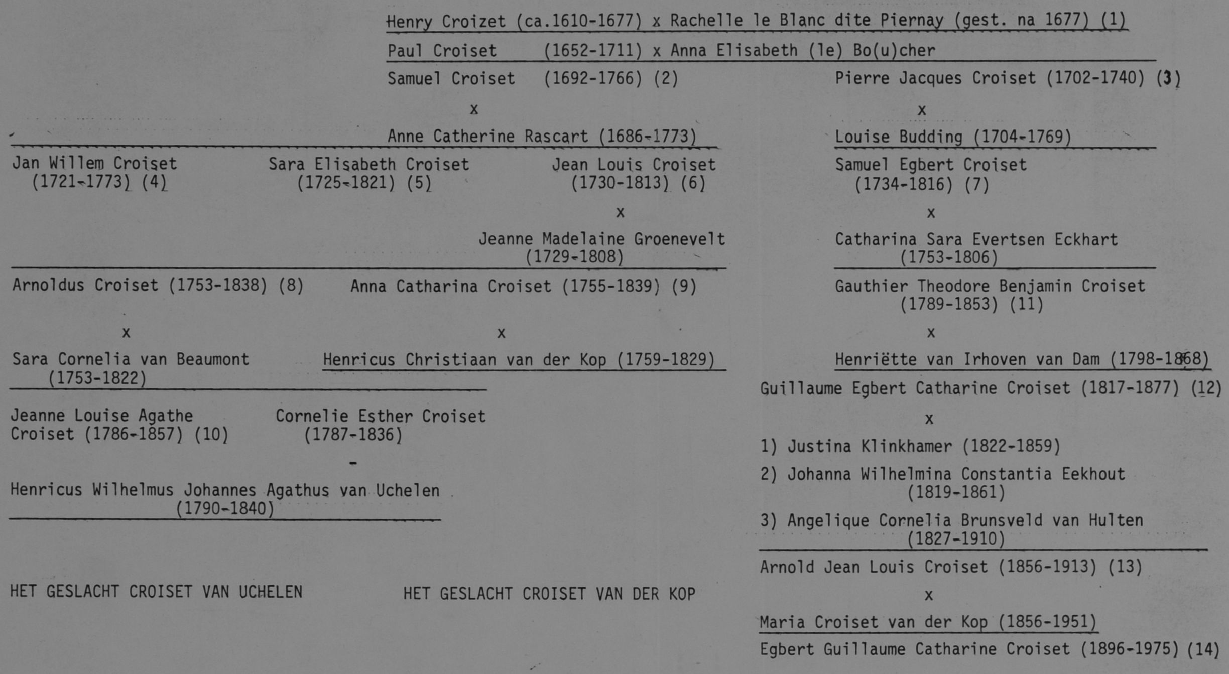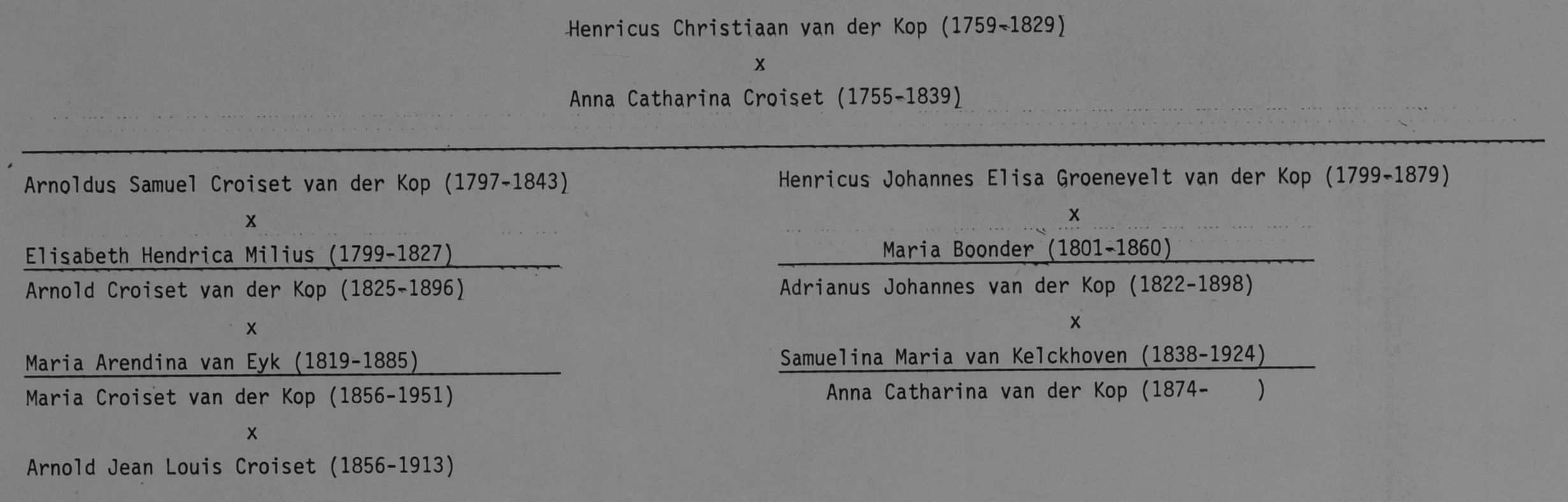 . Door een huwelijk van mr. Henricus Christiaan van der Kop (1759-1829) met Anna Catharina Croiset (1755-1839), een dochter van Jean Louis Croiset. Henricus Christiaan van der Kop vestigde zich als notaris in Schoonhoven en zijn beide zoons bleven daar als koopman woonachtig. De oudste, Arnoldus Samuel (1797-1843), noemde zich Croiset van der Kop, de jongste, Henricus Johannes Elisa (1799-1879), noemde zich naar zijn grootmoeder Groenevelt van der Kop. De kleindochter van Arnoldus Samuel, Maria Croiset van der Kop (1856-1951), huwde op 12 oktober 1888 Arnold Jean Louis Croiset (1856-1913).