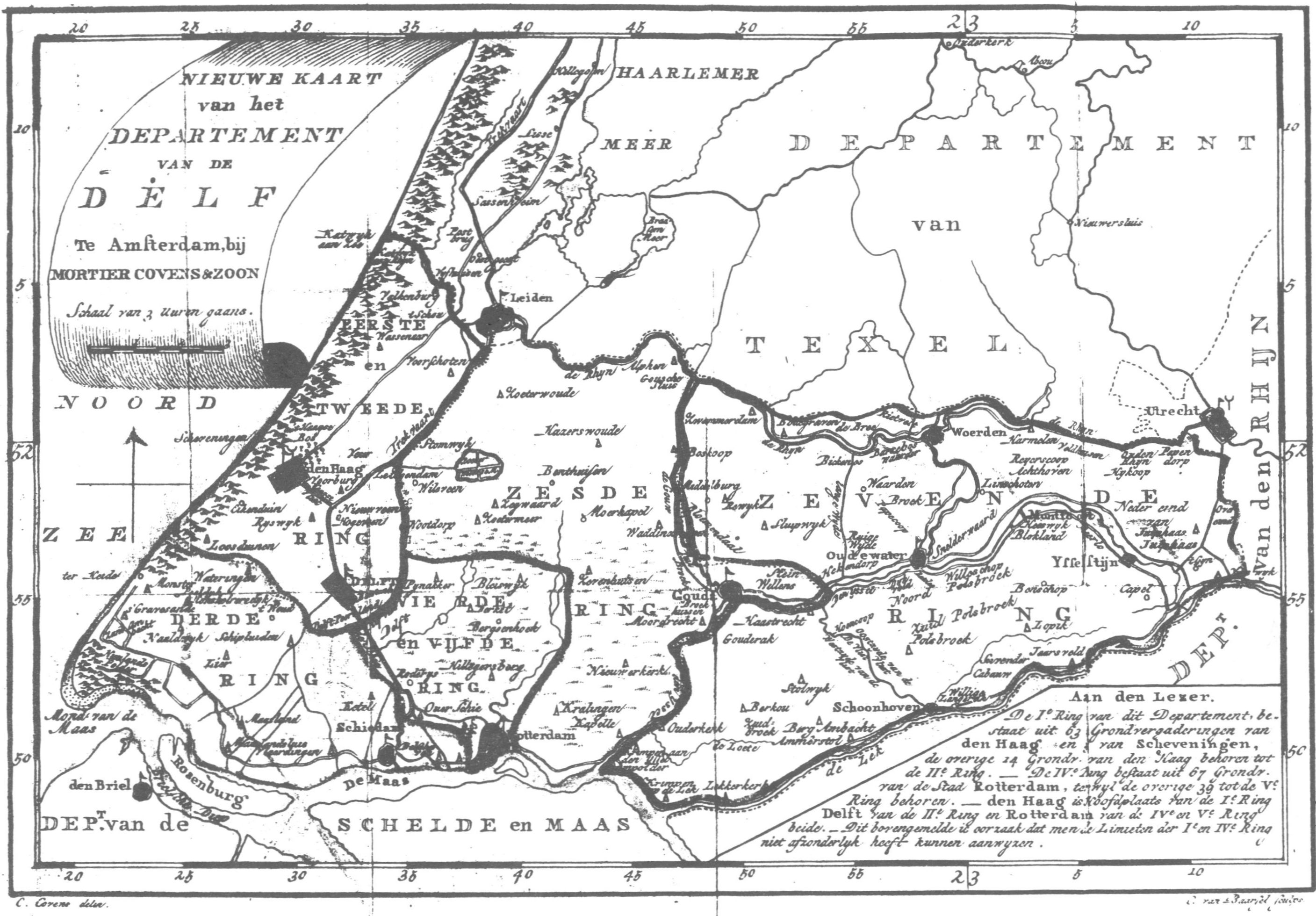 Nieuwe kaart van het Departement van de Delf. Afkomstig uit: Covens, C., Beknopte Staatsbeschrijving der Bataafsche Republiek (Amsterdam 1800), kaart tegenover p. 51.