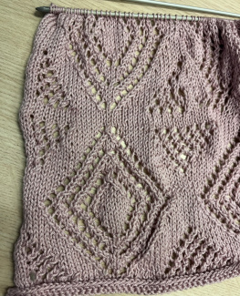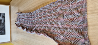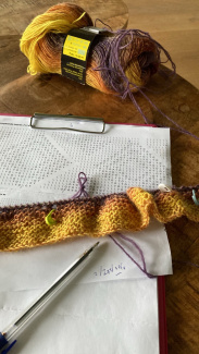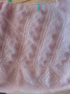 Het breipatroon bleek een hele uitdaging. Een aantal oplettende deelnemers ontdekte al breiend fouten in het handgeschreven patroon. Gelukkig attendeerde iemand met veel historische handwerkervaring ons op een boek uit 1847 waarin nagenoeg hetzelfde breipatroon gedrukt staat: Lady’s Knitting, Netting & Crochet Book, door Mrs Jane Gaugain. Op pagina 105 is het patroon van een ‘Handsome square knit shawl, of a thin lace-like fabric’ te vinden. Een plaatje van de sjaal vind je in de bijlage van dit boek op pagina 11.